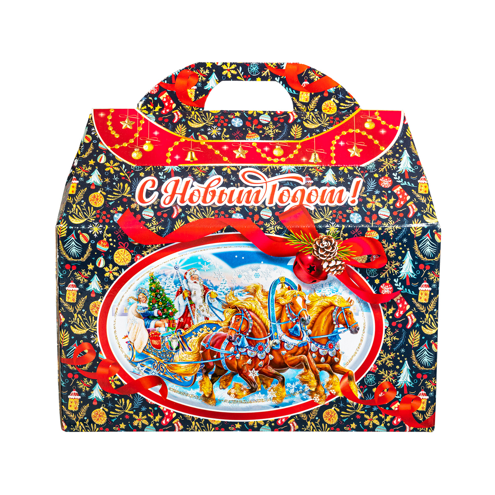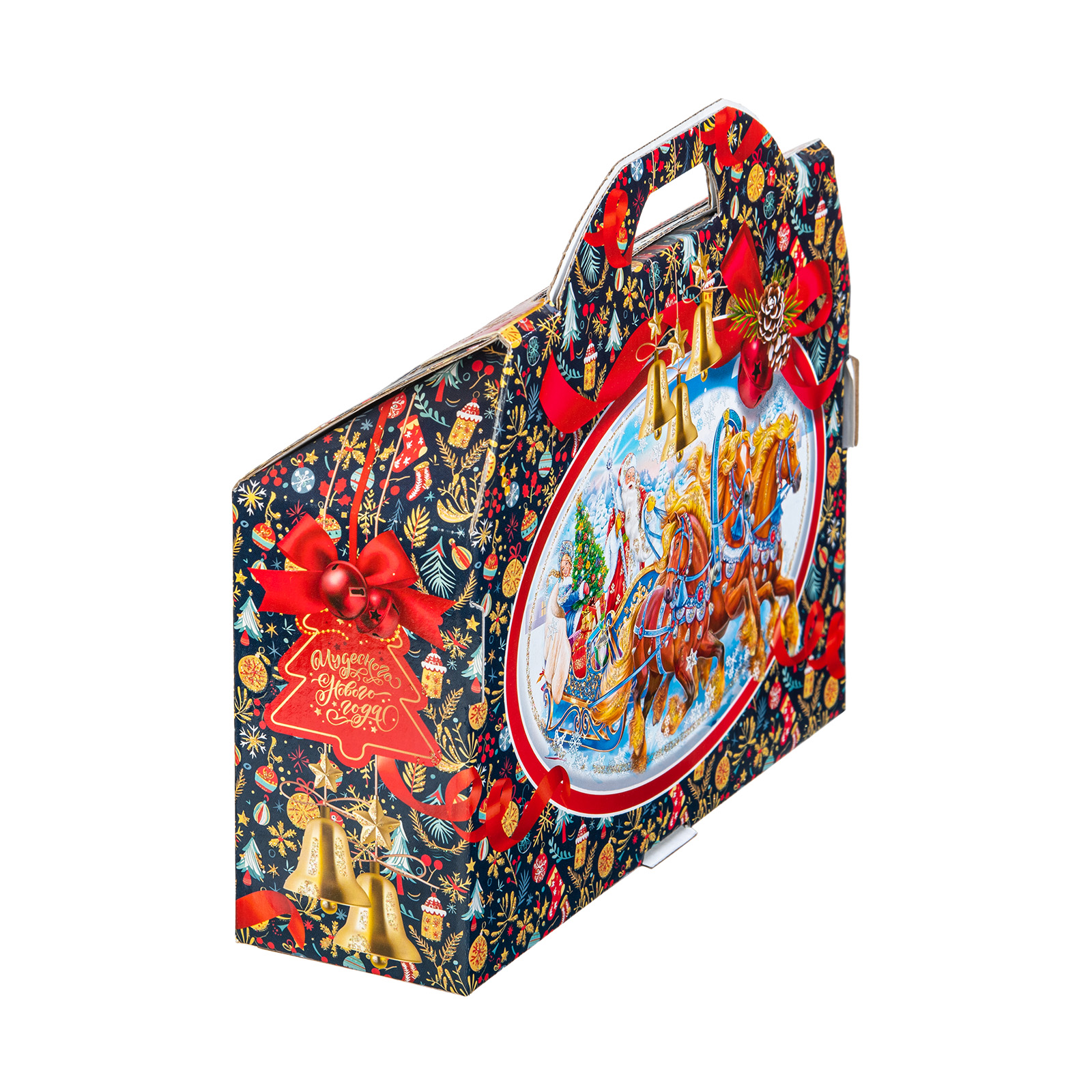 Представляем вам Новогодний Сладкий Подарок в форме стильного чемоданчика! Этот уникальный набор подходит как для подарков близким, так и для корпоративов, создавая атмосферу волшебства и тепла в эти зимние дни!Яркая упаковка сразу привлечет внимание своим оформлением: темно синий фон здесь идеально сочетается с контрастными элементами. Наличие удобной прорезной ручки делает подарок очень удобным для транспортировки.  Внутри набора находятся разнообразные вкусные сладости, которые станут украшением любого праздничного стола. Помимо сладкого наполнения, набор может порадовать небольшим памятным сувениром в виде символа наступающего года.