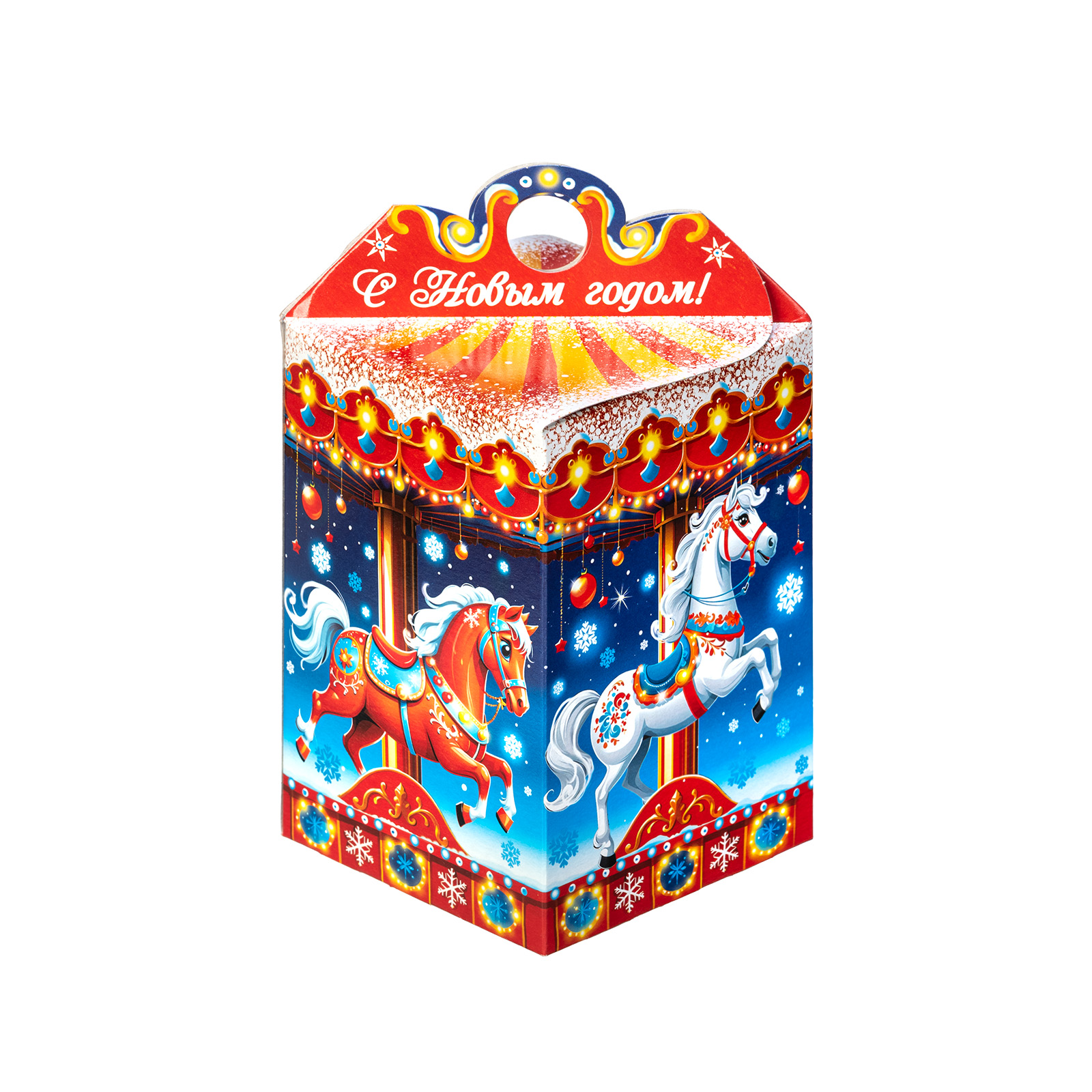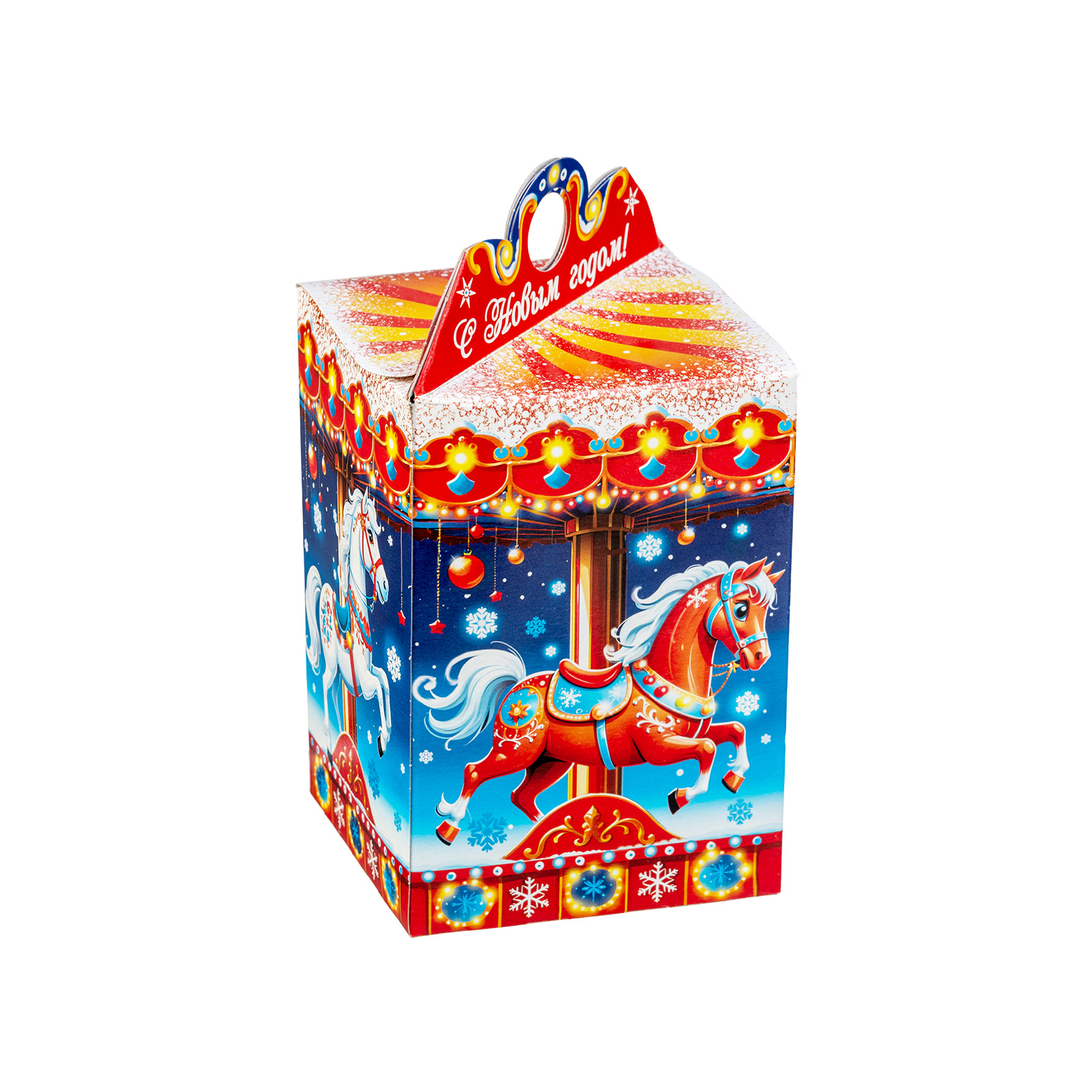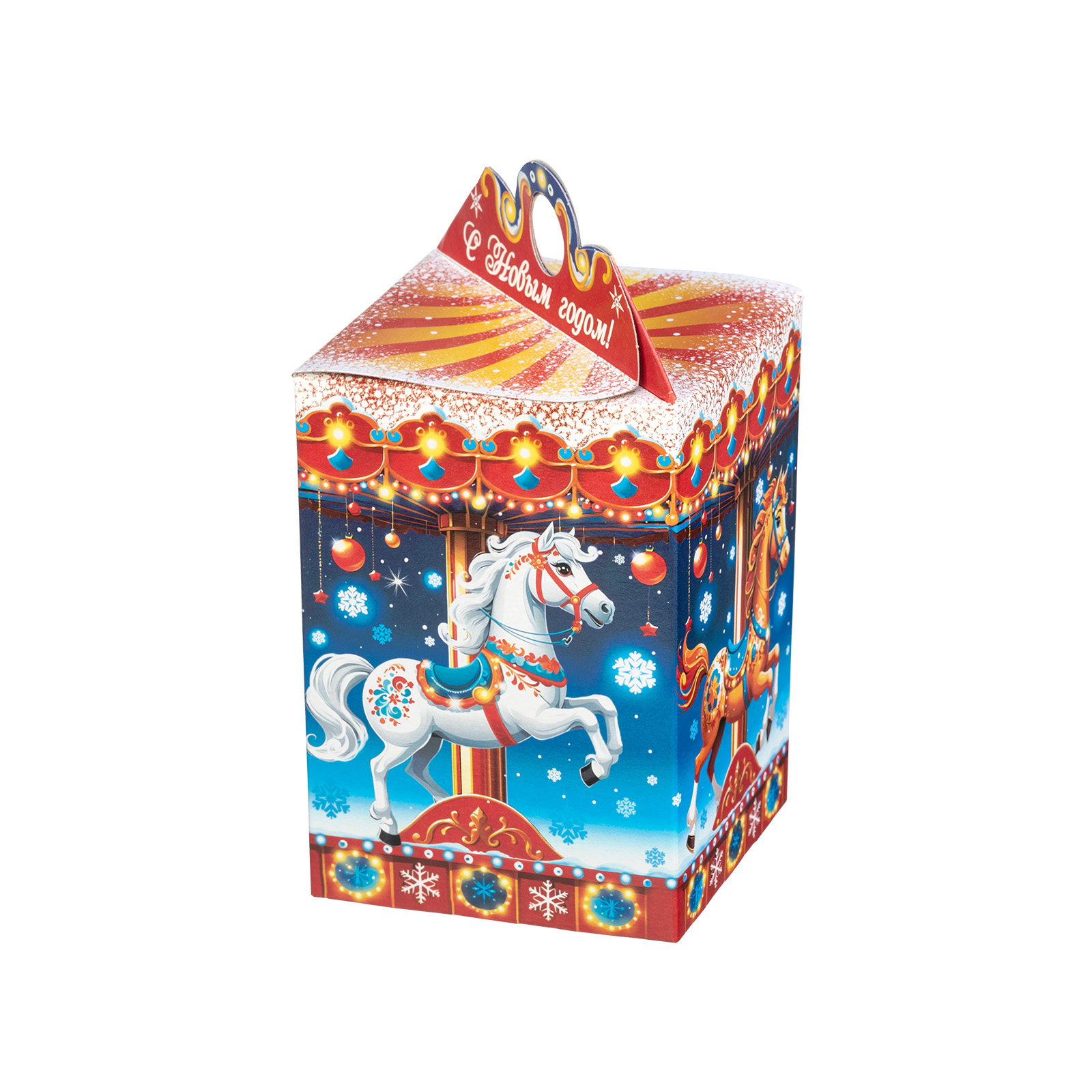 Прекрасный новогодний сладкий подарок, который поднимет настроение сластене абсолютно любого возраста. Это небольшая картонная коробочка в форме фонарика, украшенная одной большой яркой композицией. С каждой стороны нарисованы грациозные лошадки, прям как на той самой карусели из парка аттракционов! Сверху и снизу упаковки тянутся контрастные линии, украшенные новогодними символами, а на крышке есть небольшая удобная ручка и поздравительная надпись. Такой подарок будет к месту как на детском празднике, так и на корпоративе - каждый найдет в этом наборе для себя что-то приятное и теплое.