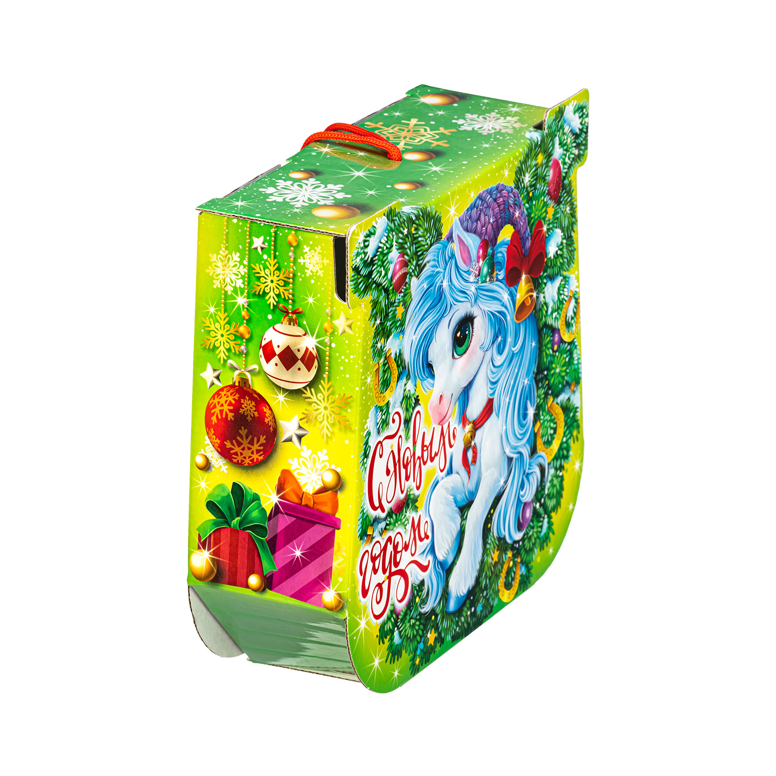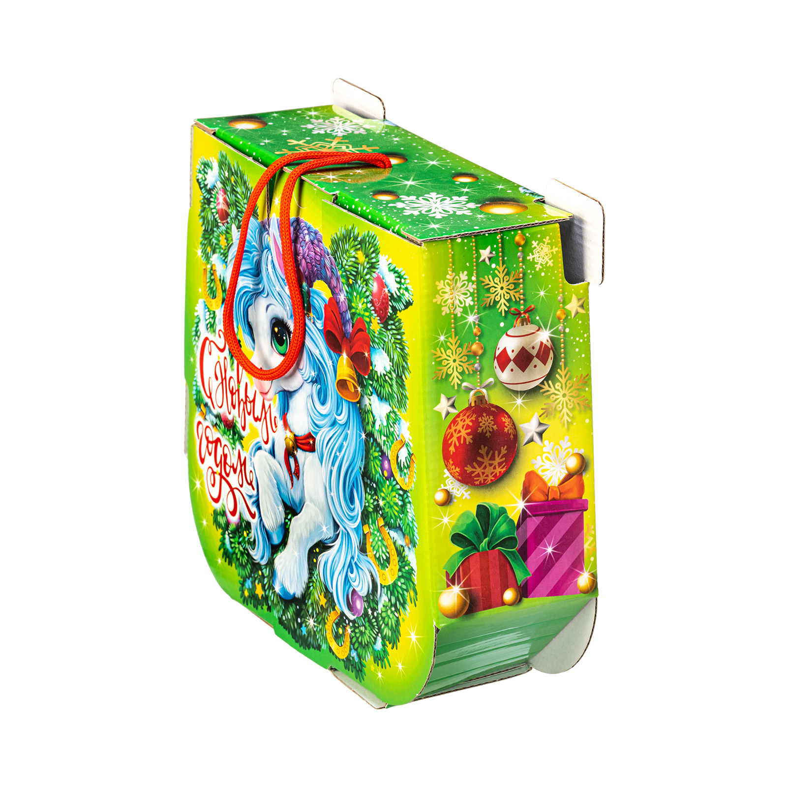 С древних времен подкова считается символом удачи, а также надежным оберегом от всех бед! Так что если хотите сделать кого-то счастливым, то подарите ему этот подарочный набор. Небольшая картонная коробочка с удобной ручкой легко вместила в себя россыпь вкусных и разнообразных сладостей, которые скрасят любой новогодний стол. Помимо сладкого наполнения в состав этой волшебной подковы входит небольшой памятный сувенир, который поможет надолго закрепить приятные воспоминания об этих замечательных новогодних праздниках!