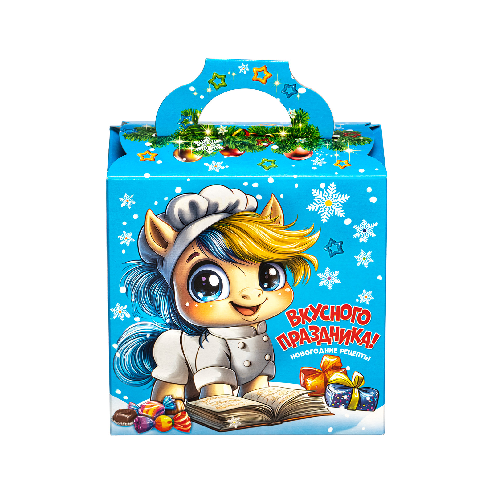 Ищете новогодний сладкий подарок для праздника в детском саду? Обратите внимание на набор “Поваренок Гоша”. За счет небольших размеров и грамотно подобранного конфетного состава этот подарок идеально подойдет для деток дошкольного возраста. Это коробочка нежно голубого цвета, со всех сторон украшенная разнообразными фигурными снежинками. На фронтальной части набора есть довольно милый рисунок: маленький очаровательной жеребенок в поварском кителе, который изучает книгу рецептов. Справа на упаковке как раз напечатан один из рецептов этой волшебной книги - обязательно приготовьте этот салат на новогодних праздниках!